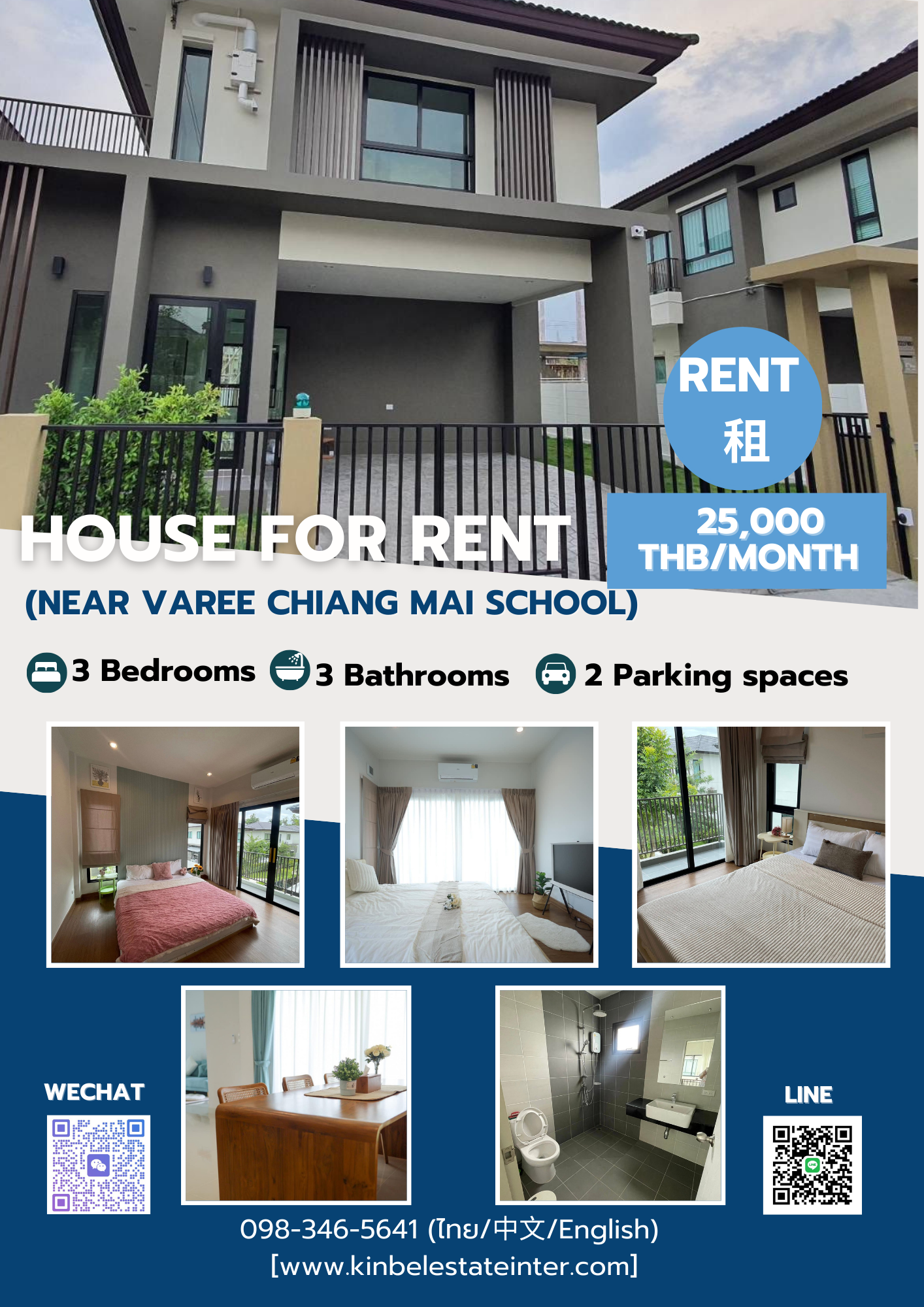 🏡 บ้านให้เช่า พร้อมเฟอร์นิเจอร์และเครื่องใช้ไฟฟ้าครบ 📍 โครงการ เพลินจิต คอลลิน่า เชียงใหม่ (Ploenchit Collina Chiangmai) ✨ หลังบ้านติดสวน บรรยากาศสงบ เป็นส่วนตัว 💰 ค่าเช่า 25,000 บาท / เดือน 📐 รายละเอียดบ้าน ขนาดที่ดิน 60 ตารางวา พื้นที่ใช้สอย 171 ตารางเมตร 3 ห้องนอน | 3 ห้องน้ำ ที่จอดรถ 2 คัน 🛋 เฟอร์นิเจอร์และเครื่องใช้ไฟฟ้า เฟอร์นิเจอร์ครบ แอร์ครบทุกห้อง ติดตั้งปั๊มน้ำแล้ว 🔐 ระบบภายในบ้าน ประตู Digital Door Lock กล้องวงจรปิดภายนอกบ้าน ระบบบ้านเย็น Air Flow ระบบอากาศบริสุทธิ์ กรอง PM2.5 📌 เงื่อนไขการเช่า สัญญาขั้นต่ำ 1 ปี ประกัน 2 เดือน + ล่วงหน้า 1 เดือน 📍 ที่ตั้ง: ถ.ดอนจั่น – สันกำแพงสายใหม่ ต.สันกำแพง อ.สันกำแพง จ.เชียงใหม่ 📌 สถานที่สำคัญใกล้เคียง สนามบินเชียงใหม่ โรงเรียนวารีเชียงใหม่ โรงเรียนมงฟอร์ตวิทยาลัย (แผนกมัธยม) เซ็นทรัล พลาซา เชียงใหม่ แอร์พอร์ต เซ็นทรัล เฟสติวัล เชียงใหม่ โรงพยาบาลราชเวช เชียงใหม่ 🏡 สิ่งอำนวยความสะดวกในโครงการ คลับเฮ้าส์ สระว่ายน้ำ ฟิตเนส สวนสาธารณะ กล้องวงจรปิด CCTV ระบบ Easy Pass ระบบรักษาความปลอดภัย 24 ชั่วโมง 📞 Contact us today to own this prime location ! Phone: 0983465641 (Thai/中文/English) WhatsApp:0983465641 (Thai/中文/English) LINE ID: 0983465641 (Thai/中文/English) WeChat ID: jinbei_viilas (Thai/中文/English) 🌐 Website: [www.kinbelestateinter.com](https://www.kinbelestateinter.com) 📌 Facebook: (https://www.facebook.com/profile.php?id=6157176164938)