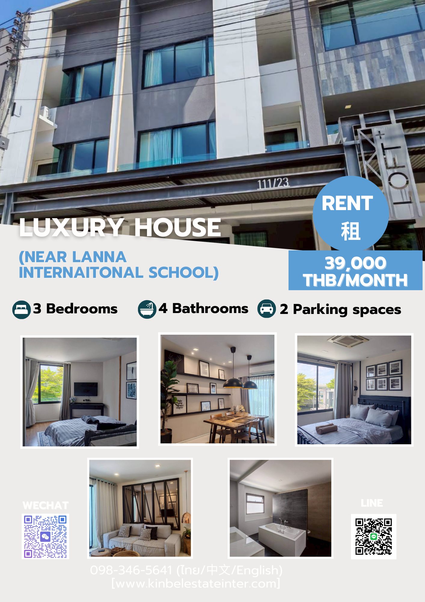 ✨ ทาวน์โฮมหรู ในโครงการเงียบสงบ 3 ห้องนอน · 4 ห้องน้ำ · ดีไซน์ Loft · สไตล์ Modern Classic 💰 ค่าเช่า 39,000 บาท / เดือน 🏠 รายละเอียดทรัพย์: • อยู่ตรงข้ามคลับเฮ้าส์และสวนสาธารณะ • ที่จอดรถ 2 คัน ชั้น 1: • ดีไซน์ Loft เพดานสูง • ห้องนั่งเล่นกว้าง • ครัวยุโรปแบบเปิด ชั้น 2: • 1 ห้องนอน · 1 ห้องน้ำ • ระเบียงกว้าง ชั้น 3: • 2 ห้องนอน · 2 ห้องน้ำ • เฟอร์นิเจอร์ครบ • พร้อมเข้าอยู่ 📌 ทำเลที่ตั้ง: • 1 กม. ถึง กาดฝรั่ง, Wine Collection, Tops, Starbucks และ Premium Outlets • 2 กม. ถึง โรงเรียนนานาชาติ SBS • 5 กม. ถึง Meritton British International School และ โรงเรียนนานาชาติ Lanna • 8 กม. ถึง Big C และ Makro • 10 กม. ถึง สนามบินนานาชาติเชียงใหม่ 📞 Contact us today to own this prime location ! Phone: 0983465641 (Thai/中文/English) WhatsApp:0983465641 (Thai/中文/English) LINE ID: 0983465641 (Thai/中文/English) WeChat ID: jinbei_viilas (Thai/中文/English) 🌐 Website: [www.kinbelestateinter.com](https://www.kinbelestateinter.com) 📌 Facebook: (https://www.facebook.com/profile.php?id=6157176164938)