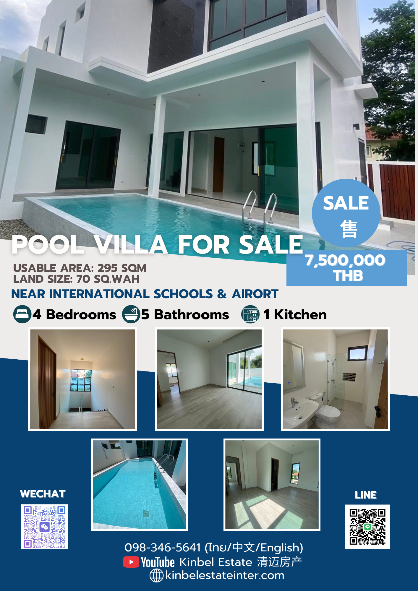 🏡 Pool Villa for Sale (Presale) – Chiang Mai 💥 Special Price: 7.5 Million THB (from 8.99 Million THB) ‼️ Only 1 unit available 📌 Prime location in Chiang Mai – Perfect for investment 💰 Rental Potential: 50,000 – 80,000 THB/month 💰 Bank appraisal allows approx. 1,490,000 THB cash remaining 👤 Direct owner sale (Agents welcome) 🏡 Property Details Usable area: 295 sqm Land size: 70 sq.wah 4 bedrooms | 5 bathrooms Parking for 3 cars Private swimming pool (3.5 × 7.5 m) ✨ Key Features Door & window height: 2.4 m Ceiling height: 3.5 m Soundproof glass Exterior wall thickness: 25 cm 📍 Prime Location – Near International schools Chiang Mai International Airport Hospitals Shopping malls (Big C, Makro, Central Airport) Restaurants & local markets 🎁 Free Extras Full-house hot water system (150L boiler) Remote control gate Digital door lock Water pump & storage tank 📄 Transfer fee: 50/50 🏡 清迈泳池别墅出售(期房 Presale) 💥 特价:750万泰铢(原价899万泰铢) ‼️ 仅此一套 📌 清迈市区优越地段 投资首选 💰 租金收益:50,000 – 80,000泰铢/月 💰 银行评估高,可剩余现金约149万泰铢 👤 房主直售(欢迎中介) 🏡 房屋详情 使用面积:295㎡ 土地面积:70平方哇 4卧5卫 停车位:3个 私人泳池(3.5 × 7.5米) ✨ 房屋配置 门窗高度:2.4米 层高:3.5米 隔音玻璃 外墙厚度:25厘米 📍 优越位置 多所国际学校 清迈机场 医院 商场(Big C / Makro / Central Airport) 餐厅 & 市场 🎁 赠送 全屋热水系统(150L) 遥控大门 电子门锁 水泵 + 储水箱 📄 过户费双方各付一半 🏡 ขายบ้านพูลวิลล่า (Presale) เชียงใหม่ 💥 ราคาพิเศษ 7.50 ล้านบาท (จาก 8.99 ล้านบาท) ‼️ มีเพียง 1 หลังเท่านั้น 📌 ทำเลดีในเมืองเชียงใหม่ เหมาะลงทุน 💰 ค่าเช่า 50,000 – 80,000 บาท/เดือน 💰 ราคาประเมิน มีเงินเหลือประมาณ 1,490,000 บาท 👤 เจ้าของขายเอง (รับนายหน้า) 🏡 รายละเอียดบ้าน พื้นที่ใช้สอย 295 ตร.ม. ที่ดิน 70 ตร.วา 4 ห้องนอน 5 ห้องน้ำ ที่จอดรถ 3 คัน สระว่ายน้ำ 3.5 × 7.5 เมตร ✨ ฟังก์ชันพิเศษ ประตู-หน้าต่าง สูง 2.4 ม. ฝ้าเพดานสูง 3.5 ม. กระจกกันเสียง ผนังภายนอกหนา 25 ซม. 📍 ทำเลใกล้ โรงเรียนนานาชาติ สนามบินเชียงใหม่ โรงพยาบาล ห้าง (Big C / Makro / Central Airport) ร้านอาหาร / ตลาด 🎁 ของแถม ระบบน้ำร้อน-เย็นทั้งหลัง (150 ลิตร) ประตูรีโมท Digital Door Lock ปั๊มน้ำ + ถังเก็บน้ำ 📄 ค่าโอนคนละครึ่ง 📞 Contact us today to own this prime location ! Phone: 0983465641 (Thai/中文/English) WhatsApp:0983465641 (Thai/中文/English) LINE ID: 0983465641 (Thai/中文/English) WeChat ID: jinbei_viilas (Thai/中文/English) 🌐 Website: [www.kinbelestateinter.com](https://www.kinbelestateinter.com) 📌 Facebook: (https://www.facebook.com/profile.php?id=6157176164938)